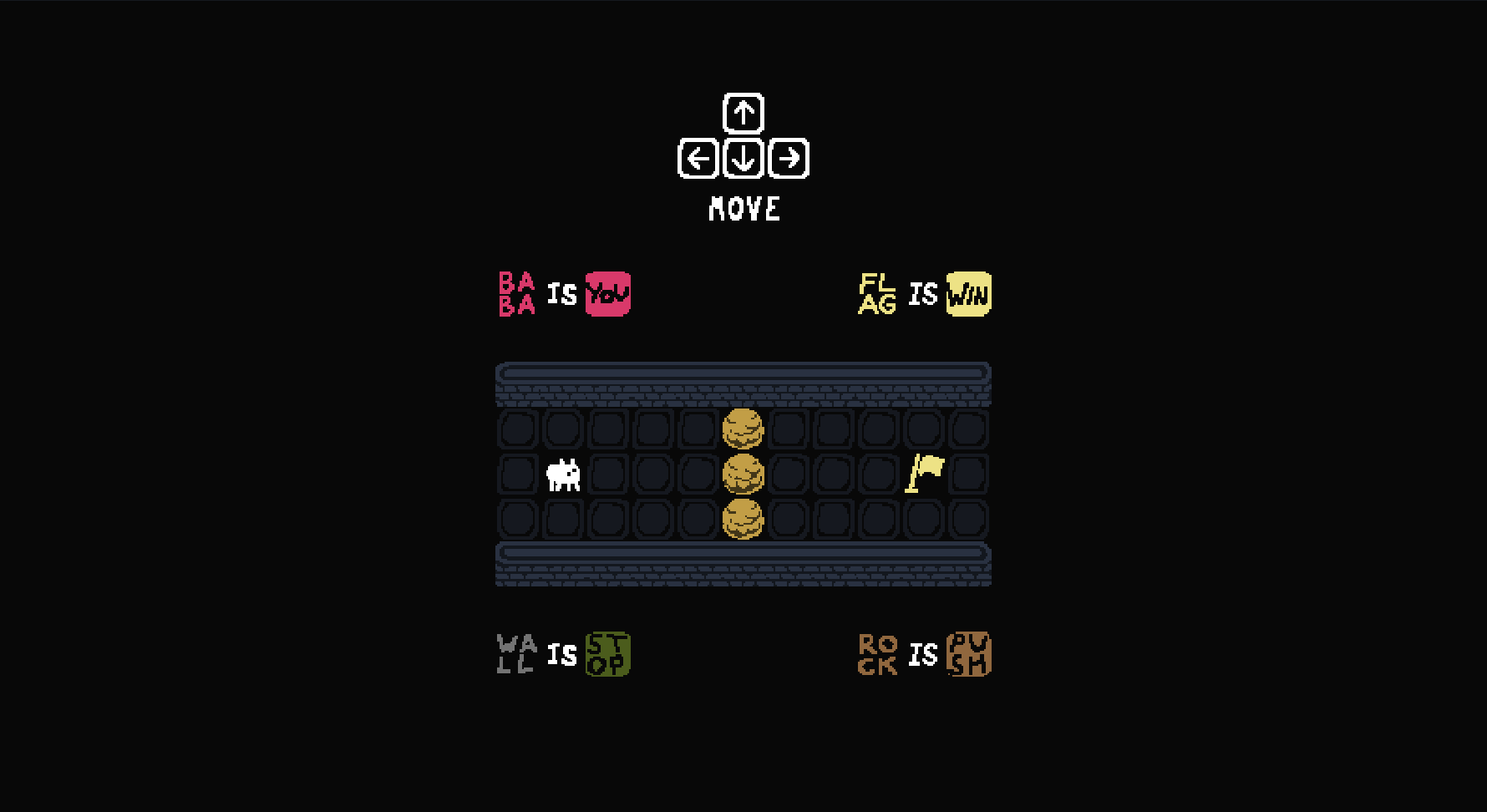 The game’s rules are laid out in simple phrases as physical objects on a gridded playing field, and are often the only objects you can interact with. In the example here, “BABA IS YOU” means that you control Baba, “FLAG IS WIN” means that touching the flag is the victory condition, “WALL IS STOP” means you can’t pass through walls, and “ROCK IS PUSH” means you can move the rocks. You could push the rock out of your way to reach the flag, or nudge one of the words out of the sentence “WALL IS STOP,” which turns it into an inactive rule and the wall will no longer offer any resistance. Alternatively, you can replace “STOP” with “WIN,” making the wall the win condition, or create the rule “WALL IS YOU,” giving yourself control of the wall and walking it into the flag to win.