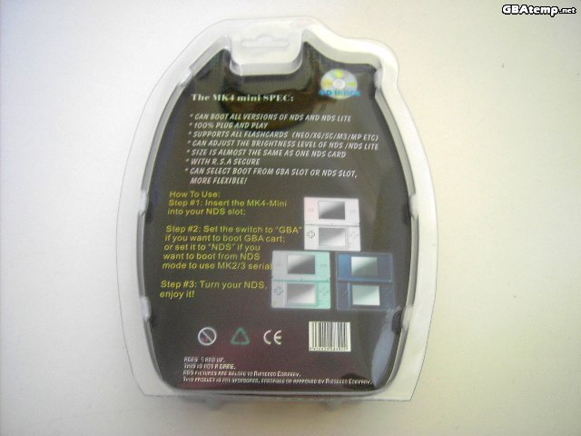 The MK4-Mini - is another NoPass device. These NoPass's are very different than PassMe's, which relied on security flaws in the DS' hardware/software to run unsigned code from the GBA slot. Instead, a NoPass device contains code that is encrypted in the same way as a regular DS game card. Which allows the DS to recognise and load it without the need for hacks, or original game carts sticking out the back. This allows for a much smaller form size.